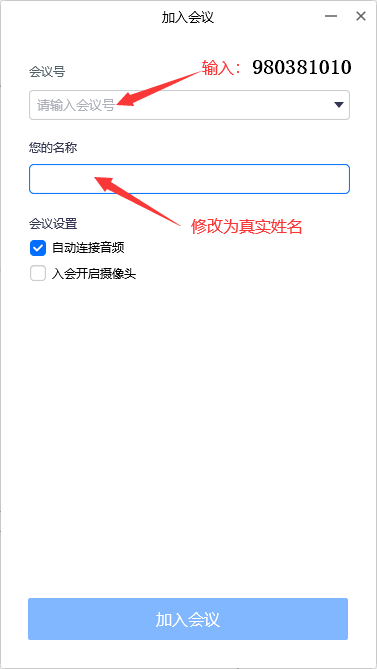 3、点击加入会议。输入会议id:980381010,填写姓名。点击加入会议。