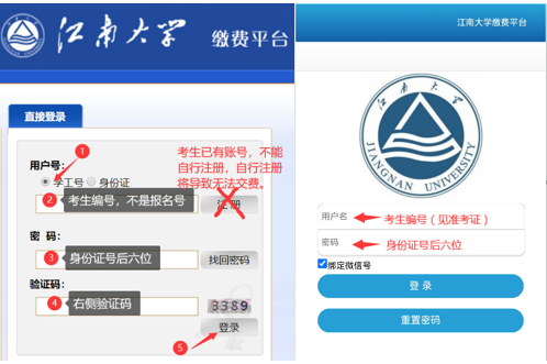 登录用户名为准考证上的考生编号(请考生下载准考证查看,准考证打印系统网址:http://yzgmis.jiangnan.edu.cn/zsgl/bswb/login.aspx),初始密码为身份证号码后6位。如不能正常显示收费项目,建议更换为360浏览器兼容模式。