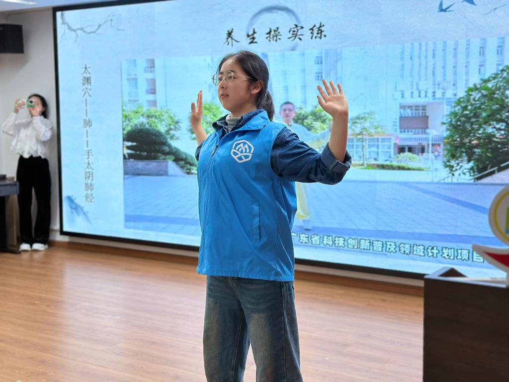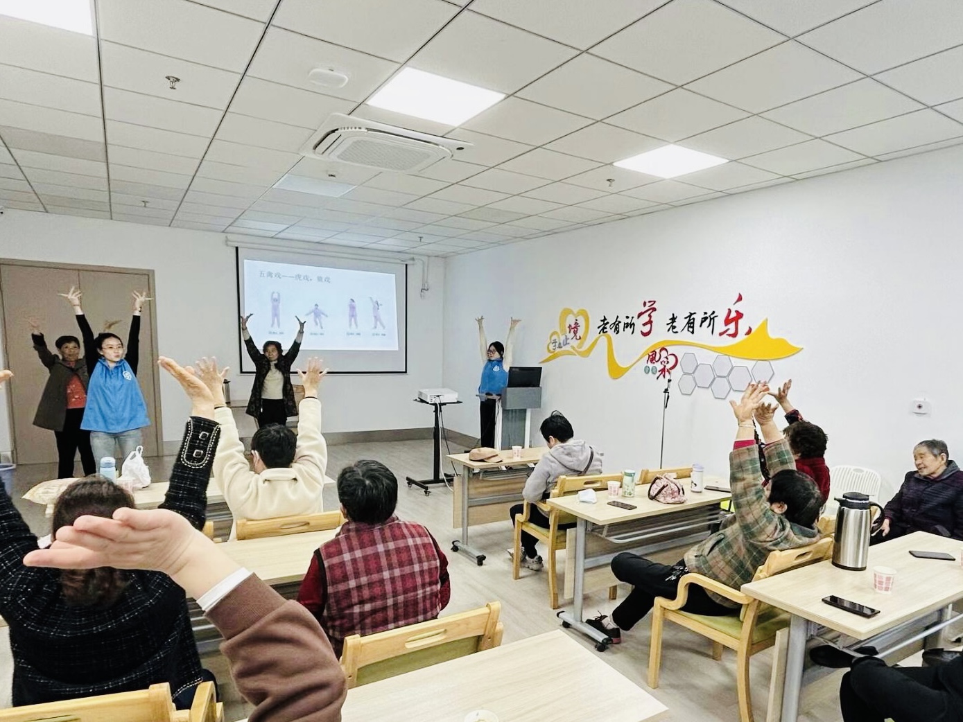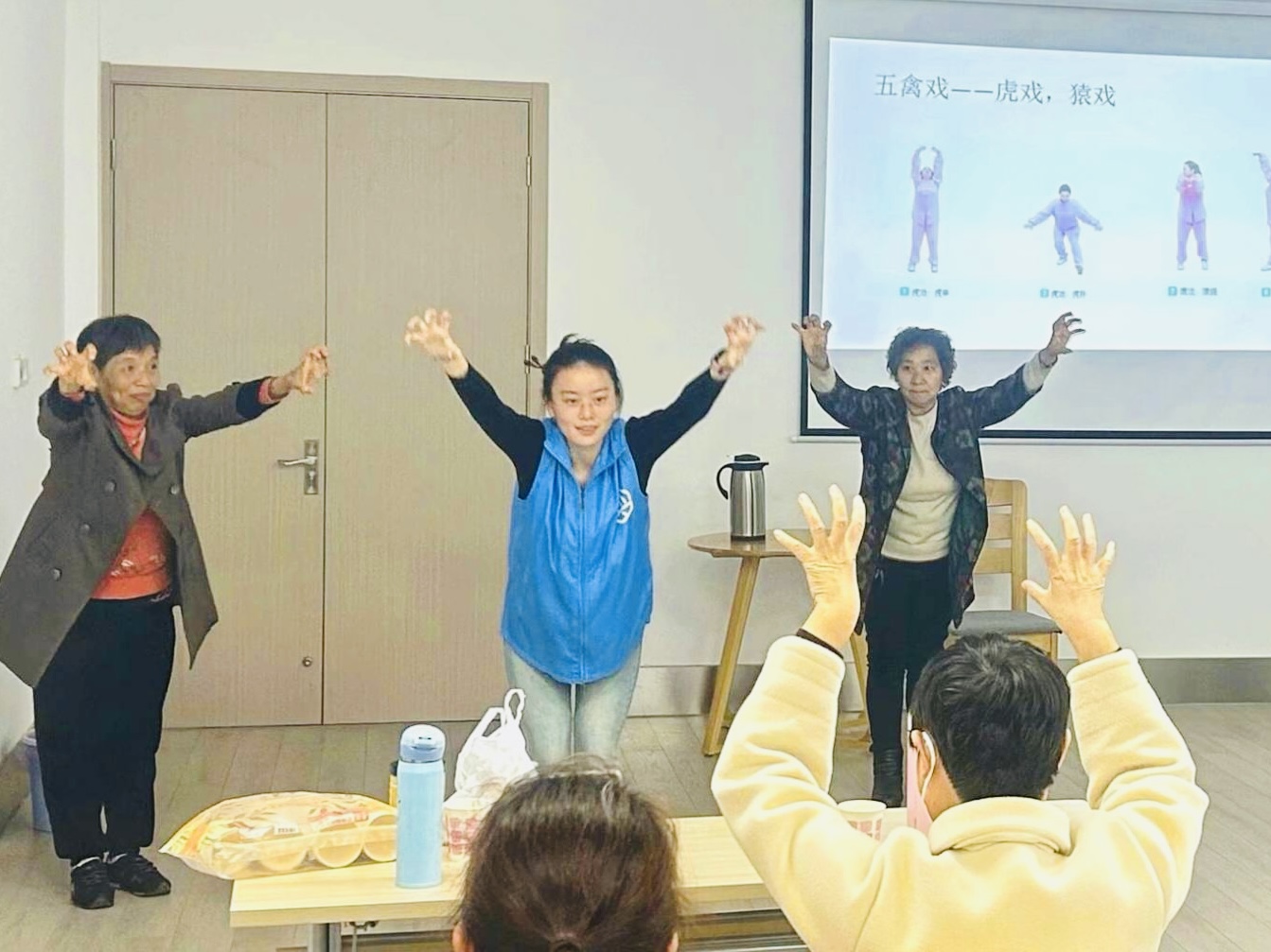 在泓澄社区,成员刘智垒、郑浩成、刘语凝、高孟健进行“清明养生季,练操通经络”主题宣讲。讲座以中药材养生茶冲泡方法引入,刘智垒介绍人与自然界是统一的整体,人的生命活动与二十四节气紧密相连。二十四节气养生就是根据不同节气特点,通过养精神、调饮食、择起居、做运动等方式来达到强身健体的目的。建议居民朋友在不同的节气要注意观察身体的反应,结合中医的调理方法,才能将生理、心理调整到最佳状态,拥有健康快乐的人生。随后,志愿者们向在座的居民展示健身气功“五禽戏”,主要选取了虎戏和鹿戏两部分,由刘语凝同学做示范,现场的居民也积极参与进来。