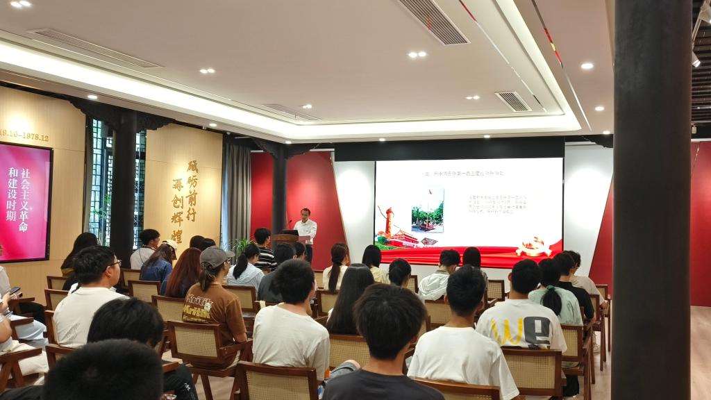 青年学子们静静聆听,目光紧紧凝望群雕,仿佛能看到先辈们眼中闪烁的希望之光。随后,众人怀着肃穆之情,瞻仰“无锡总工会第一任委员长秦起烈士铜像”。秦起短暂却壮丽的一生,为工人阶级解放事业抛头颅、洒热血,他的英勇事迹如同一座不朽的丰碑,深深烙印在大家心间。走进基地内部,党章学堂里,工作人员为大家播放红色教育宣传片,学员们沿着党章发展的脉络,探寻党的初心使命,在誓言颂的字里行间感悟信仰的力量。