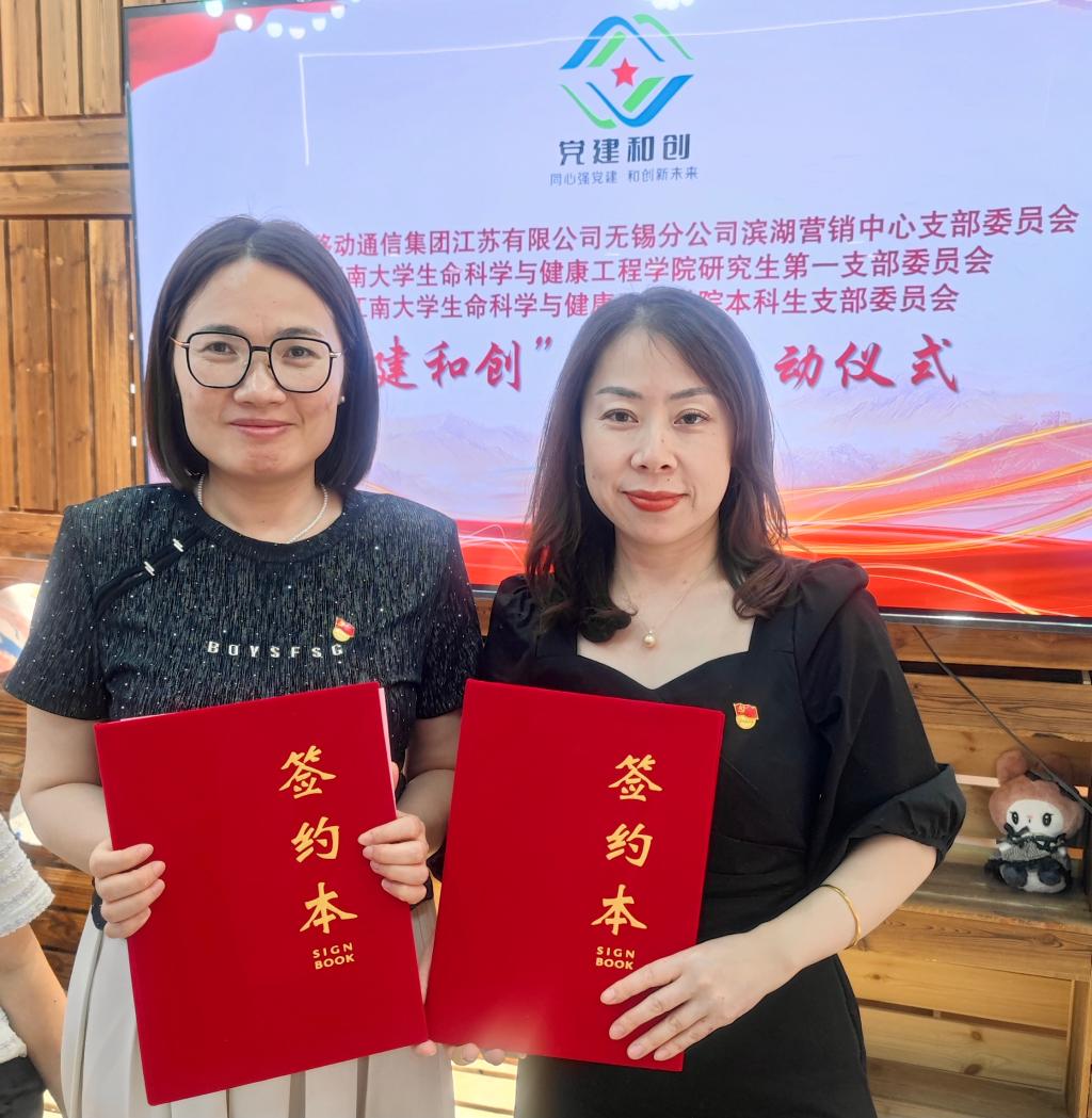 接着,孙颖代表伟德betvlctor1946源于英国研究生第一党支部及本科生党支部,瞿静代表中国移动通信集团江苏有限公司无锡分公司滨湖营销中心党支部,共同签署了“党建和创”共建协议。