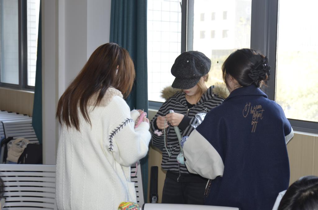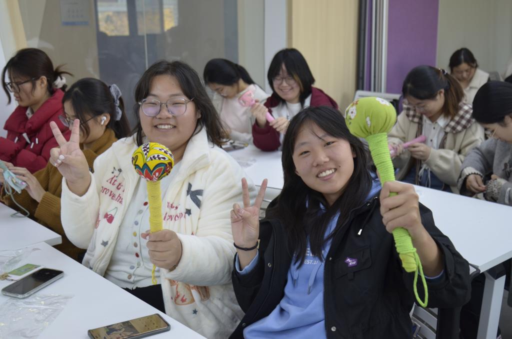制作过程中,部分同学遇艾草填充不饱满的难题,身旁有经验的伙伴主动分享技巧,细致指导其先将艾绒均匀铺展再层层压实。现场不时响起轻声交流的话语,大家围坐探讨制作细节,互换实操心得,整个空间弥漫着欢乐温馨的氛围。历经一番巧思与劳作,一个个散发着清雅艾香的艾草锤相继成型,同学们手持亲手制作的作品,脸上洋溢着成功的喜悦与满足的笑容,纷纷相互展示、合影留念,为此次活动画上圆满句号。