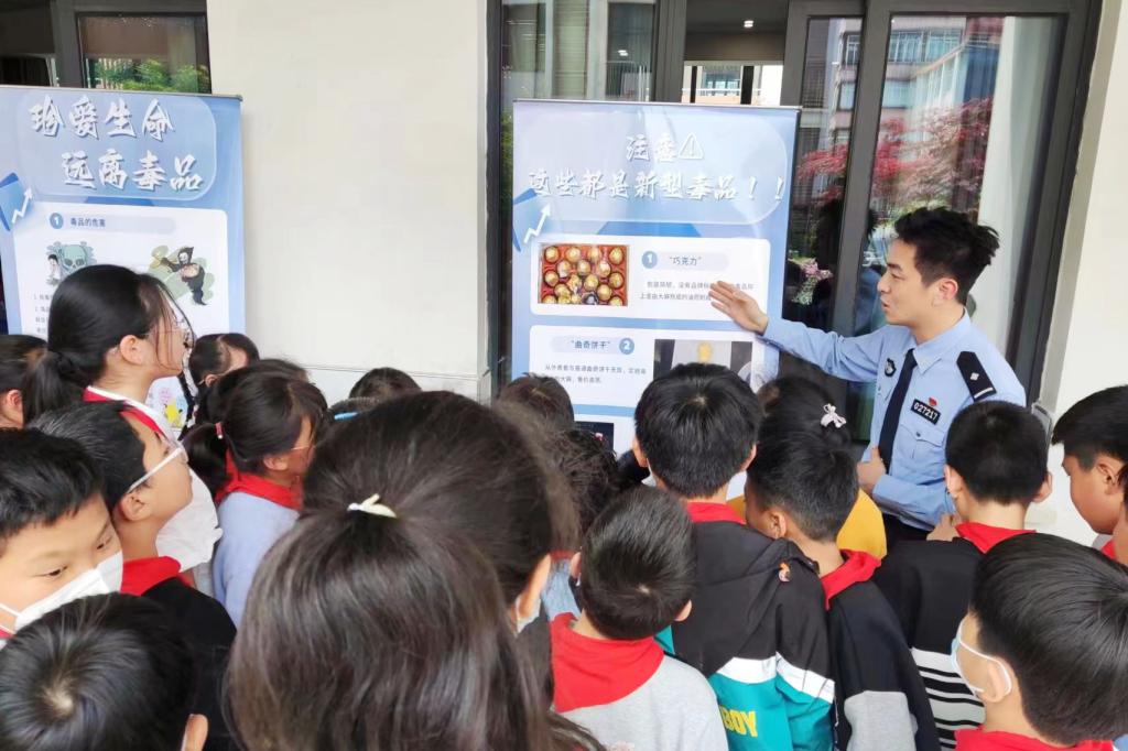 活动的最后,雪浪派出所社区民警王俊皓带领大家一起观看了禁毒展板,教育小学生们如何防范和拒绝新型毒品,号召同学们当好“禁毒宣传员”,通过“小手拉大手”的形式,让更多家庭远离毒品侵蚀,共同建设无毒校园、无毒社会。小朋友们听得聚精会神,积极互动。