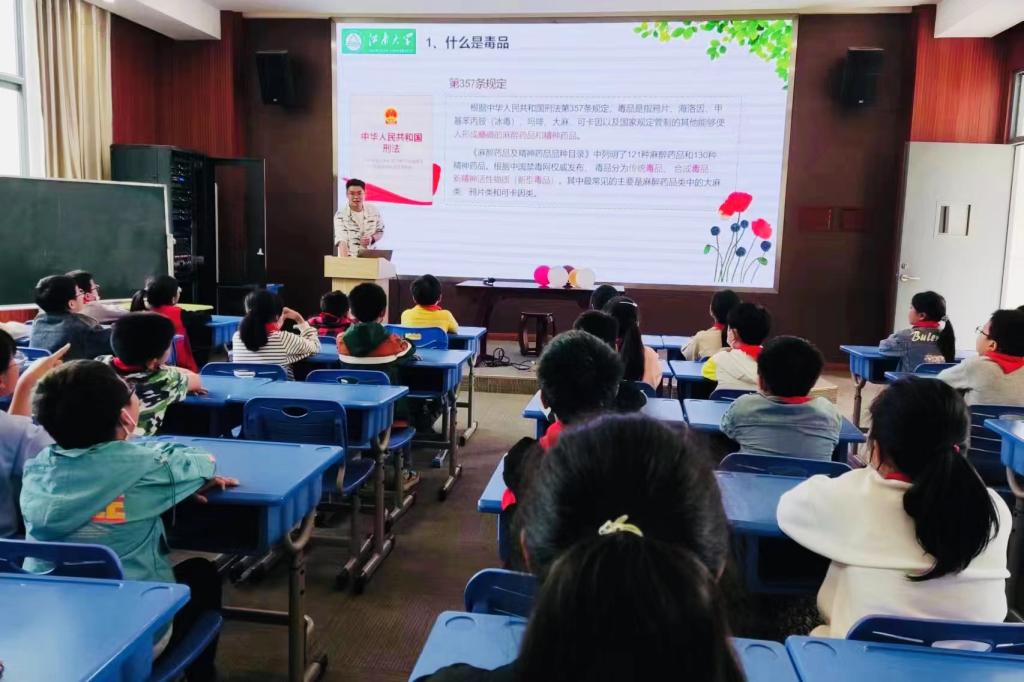 “小朋友们,做哪些事情会让人高兴呀?”活动伊始,江苏省药理学会临床前药理专业委员会委员、生科学院教授“制药伯伯”王文龙以这个问题开场,引导小学生认识毒品带来短暂快乐的表象、成瘾后的痛苦,理解“吸毒一口,掉入虎口”的真谛。随后,研究生第一党支部王子玉通过形象的图片和视频动画,用通俗易懂的语言,从什么是毒品、毒品的类型进行了生动的讲解,揭露新型毒品的伪装性、隐蔽性和迷惑性,告诉大家“这就是毒品,是我们不能碰的东西”,并且结合专业知识,用浅显直观的方式,向小朋友们解释了由于剂量和使用途径的不同,毒品与药品的关系,全方位展示了毒品的危害。