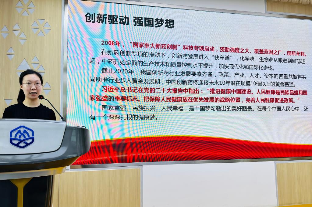 2022-2023学年校长特别奖、至善特别荣誉生奖获得者,本科生党支部副书记孙莹结合所学专业和支部实际,以“学波澜壮阔制药史 走健康中国奋进路”为题作微党课分享。她围绕“救亡图存”“百废待兴”“野蛮生长”“破旧立新”四个篇章娓娓道来,展示了百余年来中国制药产业从一无所有到制造大国的艰辛过程,呼吁新一代药学人担当起时代责任、勇于砥砺奋斗、练就过硬本领。孙莹介绍了支部学习贯彻习近平新时代中国特色社会主义思想主题教育的开展情况,支部紧紧锚定“学思想、强党性、重实践、建新功”的总体要求,以“以学为基、以学铸魂、以实为要”为基本原则,以课内课外、校内校外、线上线下“三联动”为总体思路,通过青年学生喜闻乐见的方式学思践悟新思想,用党的创新理论照耀青年学生成长之路,切实推动主题教育在大学生群体入脑入心。