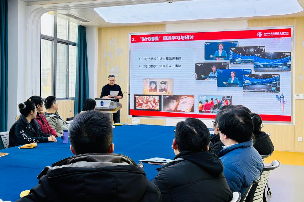 会议伊始,支部书记巩凯领学“时代楷模”杨士莪、单杏花先进事迹,号召党员教师心怀“国之大者”,共同学习、弘扬、传承好杨士莪、单杏花同志的崇高精神,坚定信心、自立自强、勇毅前行,为建设教育强国、科技强国、人才强国贡献力量。