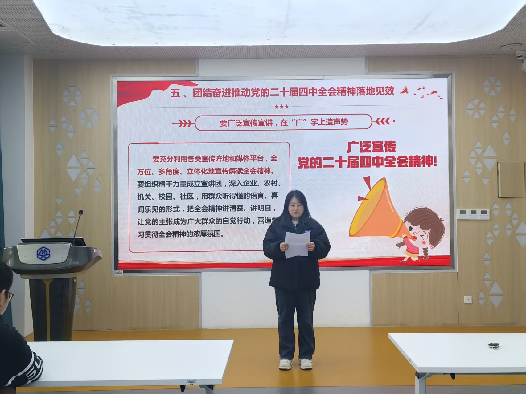 党的二十届四中全会是在向第二个百年奋斗目标进军的新征程上举行的一次十分重要的会议,是乘势而上、接续推进中国式现代化建设的又一次总动员、总部署。党课最后,杨子毅鼓励支部党员将个人成长与国家发展同频共振,把学习成果转化为脚踏实地的行动自觉,在学思践悟中成长成才。