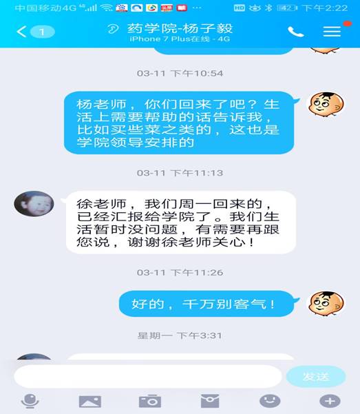 二月初,陆续有教师从外地申请返校。“疫情就是命令,防控就是责任”。为了使居家隔离的教师能安心生活,学院领导对每一位返回无锡的教师第一时间给予慰问,询问在生活方面是否需要帮助。对于需要帮助的教师,安排物资保障组落实教师的要求,使居家隔离教师能够安心生活。前后总计共给20余位教师发出帮助提示,给一位教师2次提供生活物资采购帮助。