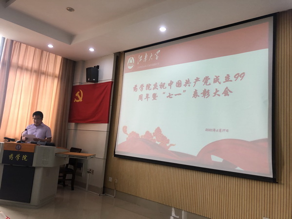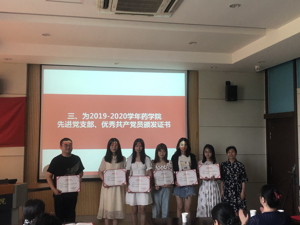 大会着重对2019-2020学年药学院“先进党支部”、“优秀共产党员”进行了表彰。经各党支部民主推荐、参照年度考核评优成绩,由党委会讨论决定,药学院教师第一党支部和研究生第一党支部荣获“先进党支部”荣誉称号,蔡燕飞、吴浩等11位师生党员获“优秀共产党员”荣誉称号。院党委书记陈霞雯和副院长李会分别为先进党支部和优秀共产党员获得者颁奖。