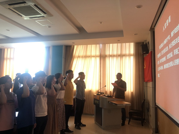 随后,在院党委委员巩凯同志的带领下,11名在校新党员面向鲜红的党旗,高举右拳庄严宣誓并在入党誓词上郑重签名。短短八十个字是党员对党的庄严承诺,也代表着对党最忠诚的决心。与会的师生党员也重温入党誓词,不忘初心、牢记使命。会议的最后,党委秘书顾峻老师对毕业生党员进行了党员组织关系转接教育。她从党员组织关系转接的含义、要求、注意事项等方面展开剖析,并结合毕业生的实际情况展开讲解,让毕业生党员清晰地了解自己党组织关系转接的各项要求。