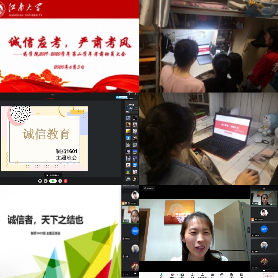 6月3日,药学院组织本科年级全体同学依托企业微信平台开展了“奋斗青春,诚信人生”主题云班会活动。2017、2018、2019年级分别开展了有关考风考纪的考前诚信动员班会,2016级各班班主任带领班级同学分别从学术研究、日常生活和毕业离校三个方面展开讨论。