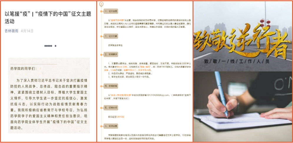 为弘扬药学院学子的爱国主义精神和责任担当意识,4月14日-5月30日期间,药学院以“共筑诚信,你我同行”为主题面向全体学生开展了“疫情下的中国”、“逆境携行,你我同心”等一系列征文活动。鼓励学生通过征文展示自己坚定目标、坚持不懈、重信守诺的品质,从而传播诚信能量,增强诚信意识。学院各学生团支部、党支部依托网络平台积极参与主题征文活动,涌现出一批充满真情实感的优秀征文。优秀征文作者之一的韩朝宇同学写到“如今新时代的我们,仍将怀揣梦想,勇于担当,鉴定信念的走下去。只有坚持不懈、重信守诺,我们才能够面对残酷的考验、战胜疫情”。本次征文活动结合疫情实际,提高了同学们的文学素养,同时激发了同学们对诚信品德和诚信精神的传承,培养了同学们诚实守信、爱国爱校的优秀品质。