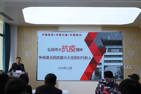 抗疫精神是爱国主义、集体主义、社会主义精神的传承和发展,可以高度概括为生命至上、举国同心、舍生忘死、尊重科学和命运与共。在抗疫过程中涌现出一批批英雄,比如敢医敢言、勇于担当的钟南山院士;义无反顾、冲锋在前的武汉金银潭医院院长张定宇医生;更有身边的榜样无锡市首批援鄂医疗队队长吴小龙医生等。陈校长勉励全体学生,向英雄致敬,向他们学习,深入贯彻抗疫精神。最后,陈校长总结了目前中国疫情防控常态化的举措并对呼吁同学们争做硬核青年,彰显青春的蓬勃力量,更要正确认识世界和中国发展大势,既树立远大抱负,又要脚踏实地,用勤奋拼搏出人生的最美图景。