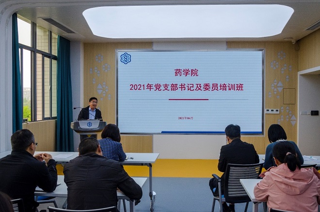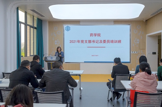 4月27日,药学院2021年党支部书记及支部委员培训班在306会议室举行,本期培训主题为“学党史、强信仰、提能力”。学院党委书记陈霞雯、党委副书记白冰、副院长杨子毅、党委委员巩凯、专职组织员葛玲以及师生党支部书记、委员等30余人参加了培训,培训围绕制药史中的党员故事和党员发展的流程规范两个主题展开。