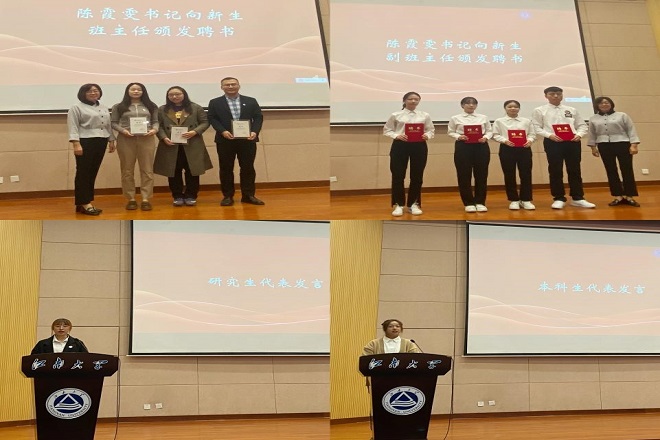 在庄严的国歌声中,典礼正式拉开序幕。党委书记陈霞雯对新生表示欢迎并致词。她在发言中强调,要将“请党放心,强国有我”的誓言落于行,增强药院人的志气、骨气、底气。对此,她向新生提出五点建议:要勇于立志,追求高远的价值;要善于思考,养成独立的人格;要精于所学,练就过硬的本领;要积极实践,拓宽交流的平台;要学会珍惜,成就幸福的人生。最后,陈书记衷心祝愿2021级全体新生全力奔赴梦想、勇做时代新人,在药学院度过美好、无憾的求学时光!陈霞雯书记为新生班主任和学生副班主任颁发聘书。