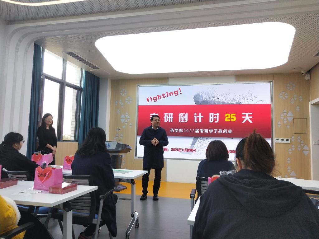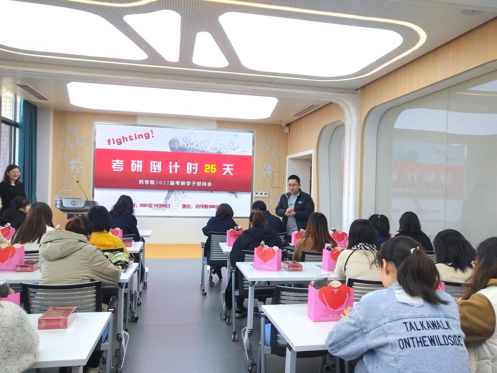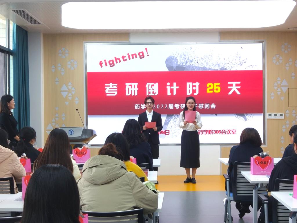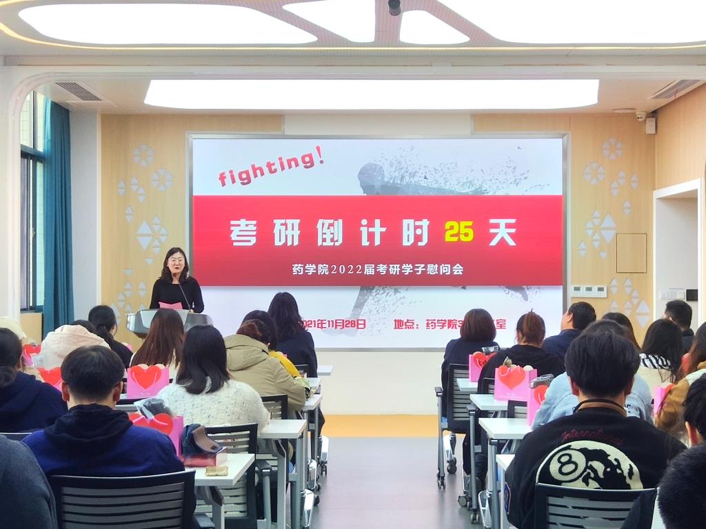 “窗外的风景从晨雾弥漫到夜幕降临,不变的是考研学子们专注的身影……”,一阵阵深情温暖而又充满力量的朗诵声从药学院306会议室传出,2021年11月29日下午,药学院开展2022届考研学子慰问活动。党委书记陈霞雯,院长、药学1801班主任陈敬华、制药1801班主任史劲松,党委副书记、副院长蒋艳以及2018级毕业班辅导员任学敏出席了本次活动,近60名考研学子到场。本次活动由任学敏主持。
