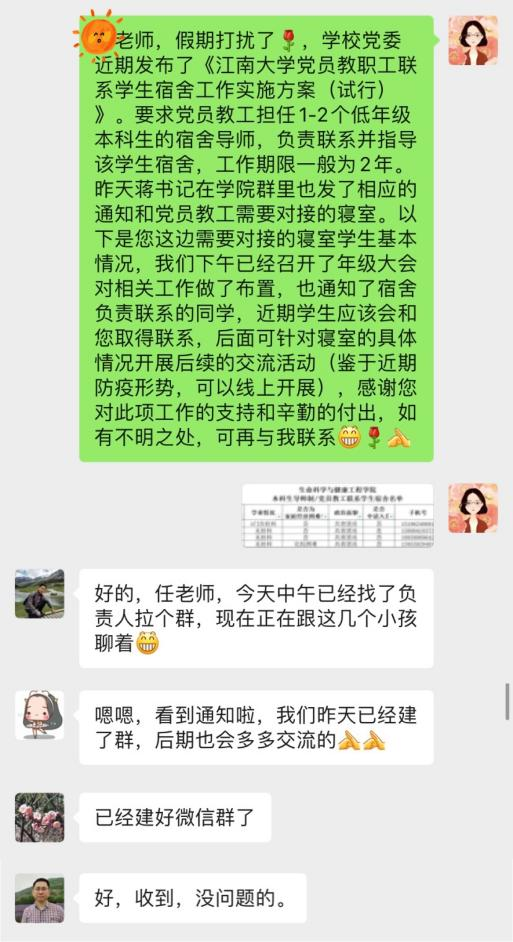 学院党委高度重视,第一时间召开党员教职工联系学生宿舍工作部署会。院党委书记陈霞雯向教工支部书记转达了学校党委组织部文件精神,并向党员教师提出三点要求,即联系学生要切实落地落实,关心关爱要真正温心温暖,教育引导要真正入脑入心。2021级辅导员王珏立即召开全体学生年级大会,第一时间传达学院工作要求,希望同学们主动联系党员教师,充分发挥学习交流的主观能动性。