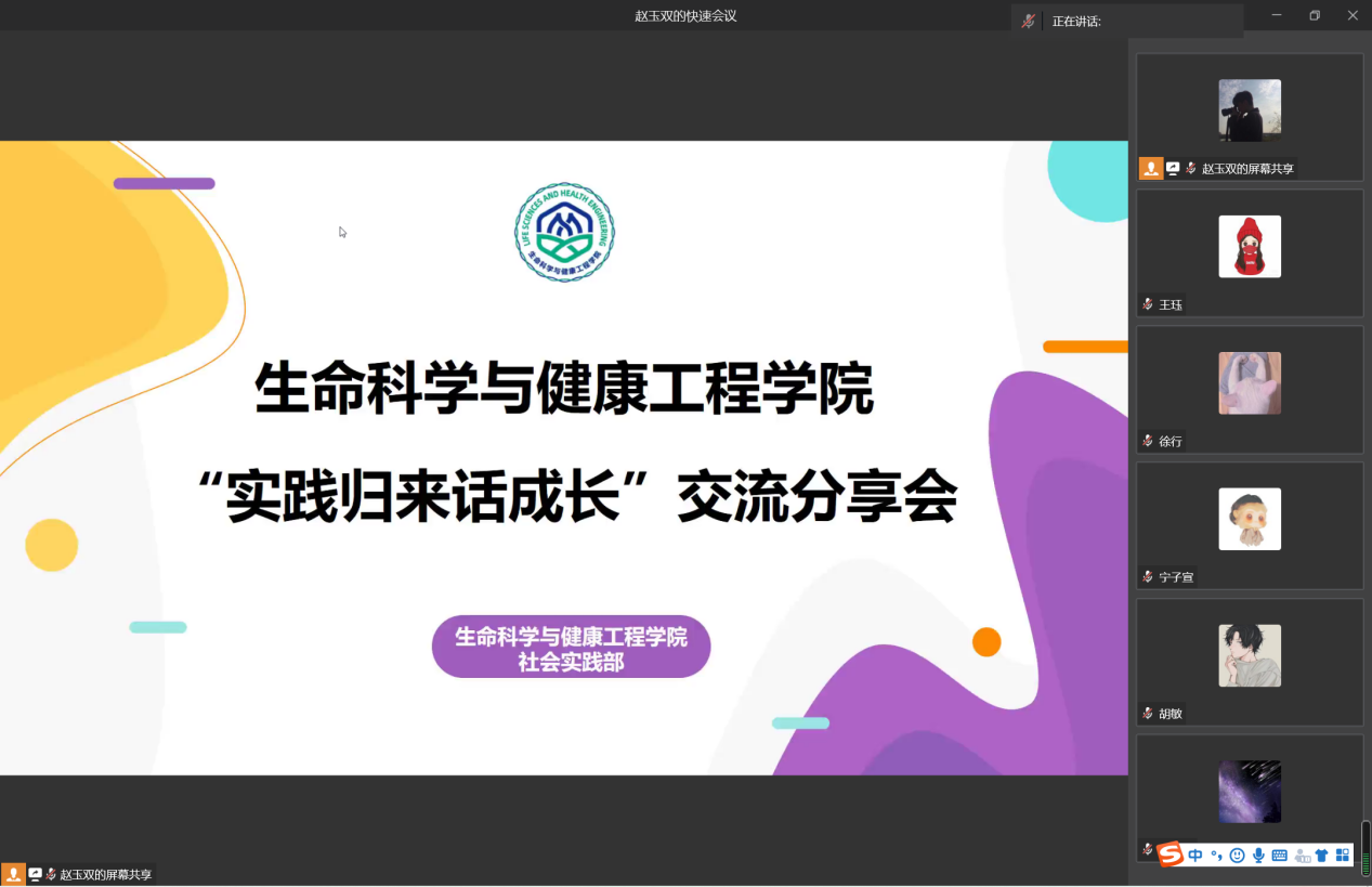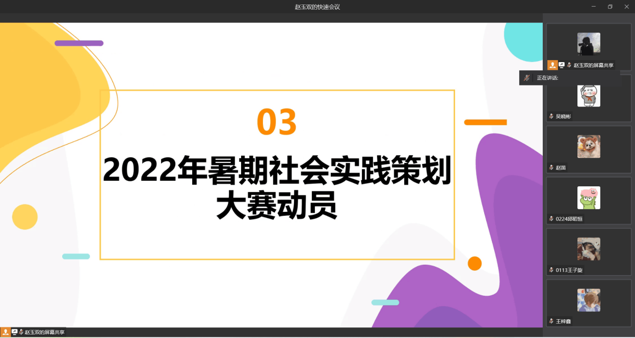 最后,王珏老师介绍了今年暑期社会实践策划大赛的相关情况,结合“喜迎二十大、永远跟党走、奋进新征程”主题,建议同学们从八个分主题、七条实践路线入手,在遵守当地新冠肺炎疫情防控的相关部署和学校疫情防控要求的前提下开展实践调研活动,为自己的大学生活增添一段难忘的时光。