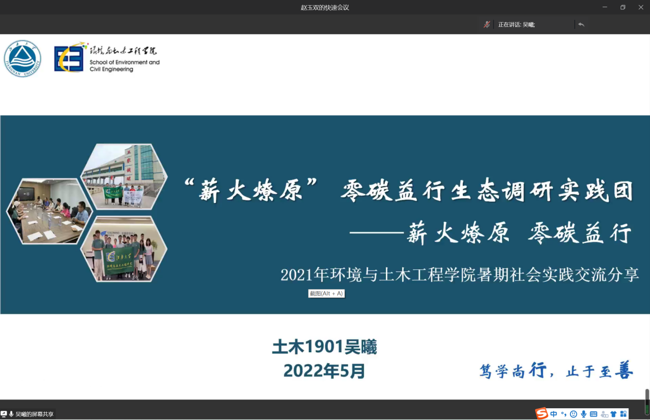 来自环境与土木工程学院“薪火燎原,零碳益行”实践团的吴曦队长分享了团队以双碳目标为青年使命担当,自6月下旬起,团队成员便前往无锡、阜阳、合肥、金华等地相关单位进行实地调研,为后期在家乡展开低碳活动提供了坚实的现实依据并为解决当地环境问题提供了参考方向,更加坚定了他们守护绿水青山、建设美丽中国的初心和使命。