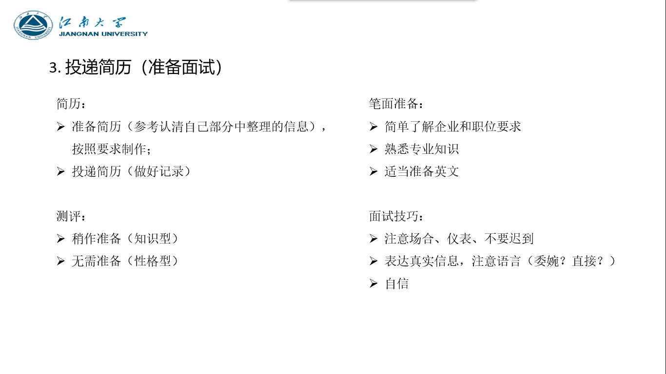接下来郭良雨从认清定位,职位调研,投递简历和工作取舍四个方面为大家做分享。郭良雨强调,在找工作前要认清自己的定位,在求职前要充分想好自己的个人情况、求职意向和求职状态,明确自己的目标。坚定下来后,就要进行职位调研,辨别信息的真实度。在简历制作方面,郭良雨提醒同学们简历需要简洁明了,学生工作经历、科研经历和学习成绩等招聘公司关注的信息需要重点突出。除了简历这一关,有关笔试和面试环节如何准备等内容,郭良雨更是将他了解到和经历过的所有信息都和大家进行了有针对性的分享。最后,郭良雨提醒同学们在面对多个OFFER时要学会取舍,没有OFFER时要调整心态。