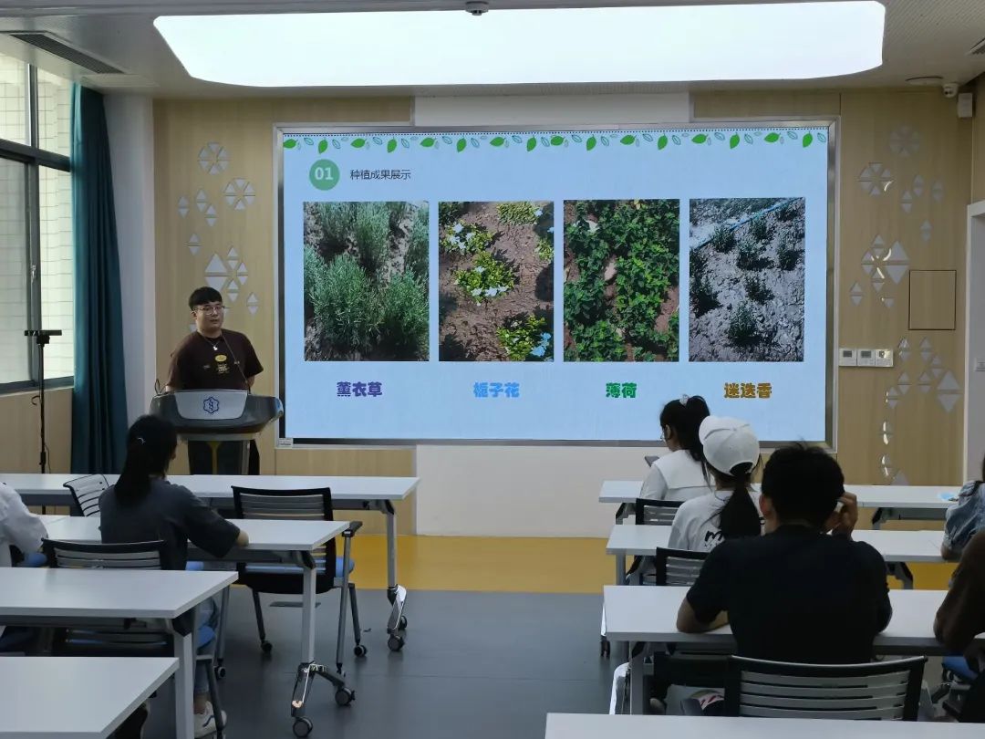 会议第二部分药草种植心得分享,分别由栀子花二组,薰衣草五组以及薄荷一组的同学代表发表本次药草种植的心得体会。同学们均表示在本次药草种植活动期间,深刻地体会到了药草种植的乐趣,学习到了药草种植小知识,增进了与其他同学之间的交流沟通,明白了药草种植的艰辛与不易,最重要的是在种植中放松了自我,疏解了情绪,充分感受到大自然的魅力,见证了生命的绚烂与美好。