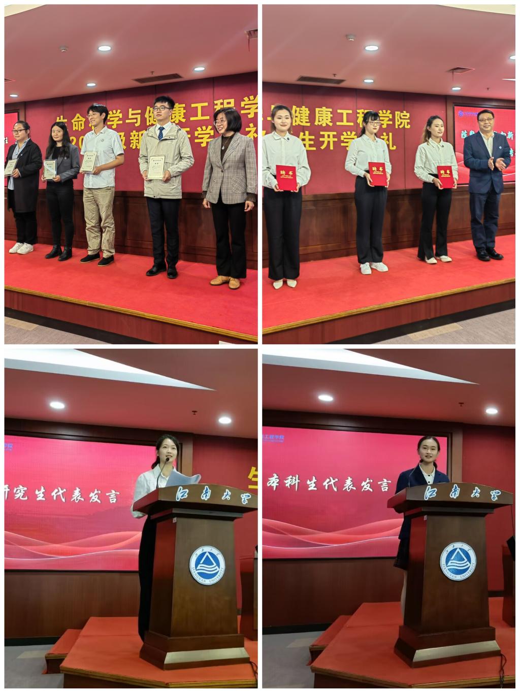 学习身边榜样,凝聚奋进力量。药学22硕何丽作为研究生新生代表发言,作为已经在伟德victor1946就读四年的学姐,她建议大一萌新们要珍惜时光,不断充实自我,抓住机会,努力成长;作为一名研究生新生,她期待着更多知识的洗礼,更多机遇与挑战的磨砺,更期待着学习如何做人做事做学问,希望全体新生一起无畏向前,共同创造充实而有意义的青春年华。药学2202班陈佳颖代表本科新生发言,她把大学看作学习、感受生活和社会实践的舞台,希望和同学们一起勇于尝试新事物、追求梦想,热切盼望着在大学这方让理想飞翔的天空,新生们能够乘风扶摇而上,前路漫漫亦灿灿,以梦为马向未来。
