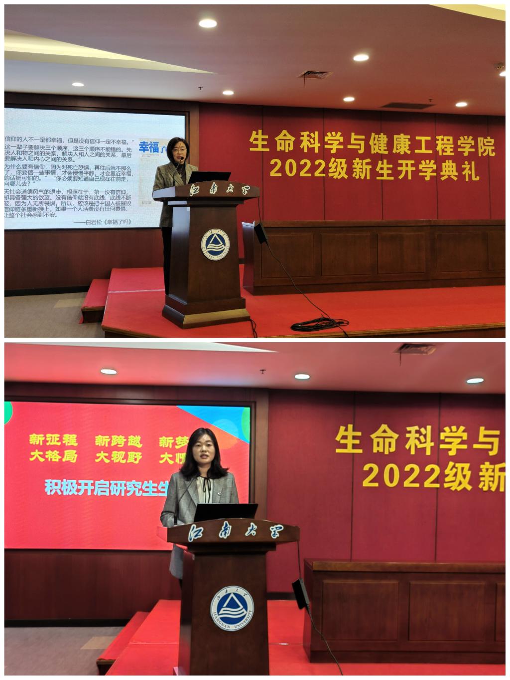随后,党委副书记副院长蒋艳以《新跨越新梦想 积极开启研究生生活》为主题开展研究生入学转型教育。她围绕研究生学习与科研、研究生党建、研究生心理健康等方面内容,剖析了研究生阶段的学业特点和方法,解读了党建工作流程和要点,引导学生们重视身心健康,激励同学们厚植家国情怀、敢于探索勇于创新、慎始敬终行稳致远,期待每位研究生与生科院的这场相约,能成为自己人生中精彩、自信、难忘的篇章。