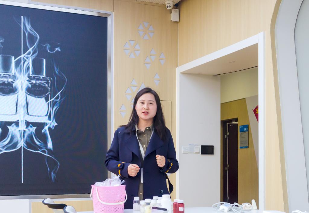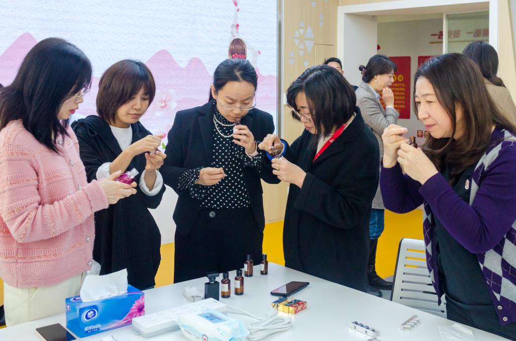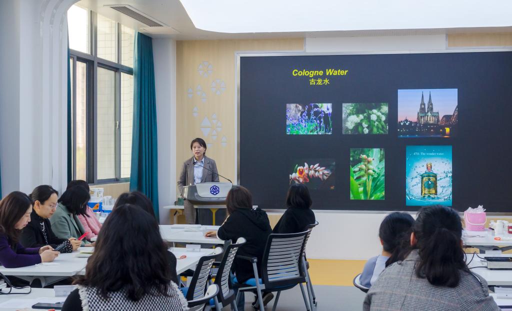 香水制作环节,在储鸿老师指导下,女教工们根据自己的喜好,细心挑选主香调,然后进行香基称量和香精勾兑,随后按比例进行配比,耐心调制。迷人的香气,精致的瓶身,活动过程中通过闻香、调香,大家也在不知不觉中把工作和生活带来的压力和疲惫卸下,悠然享受午间时光,领略香水的优雅魅力。