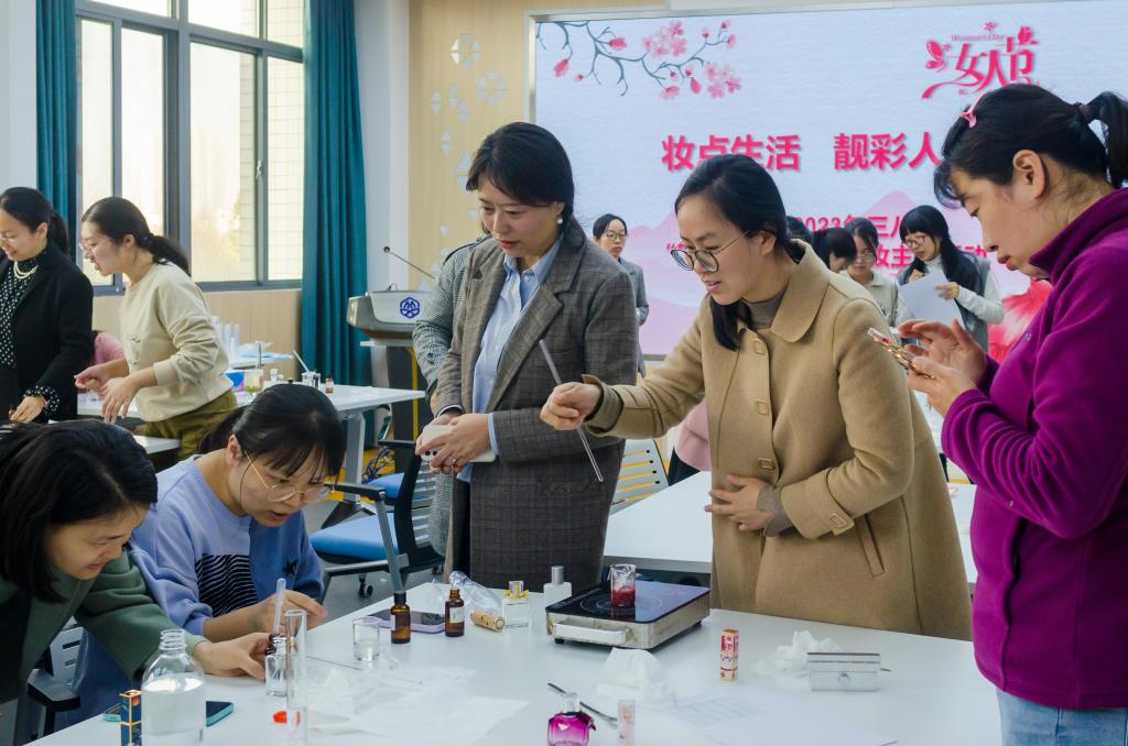 微风渐暖、花香渐浓。在生机盎然的3月,为丰富女教工精神文化生活,提高艺术修养和生活乐趣,伟德betvlctor1946源于英国分工会于15日下午在学院306室组织开展了以“妆点生活 靓彩人生”为主题的“香水&口红DIY”美妆活动。活动专门邀请了化学材料与工程学院储鸿和陈凤凤两位老师进行现场指导,学院女教工积极参与其中,度过了一段欢声笑语的午后时光。