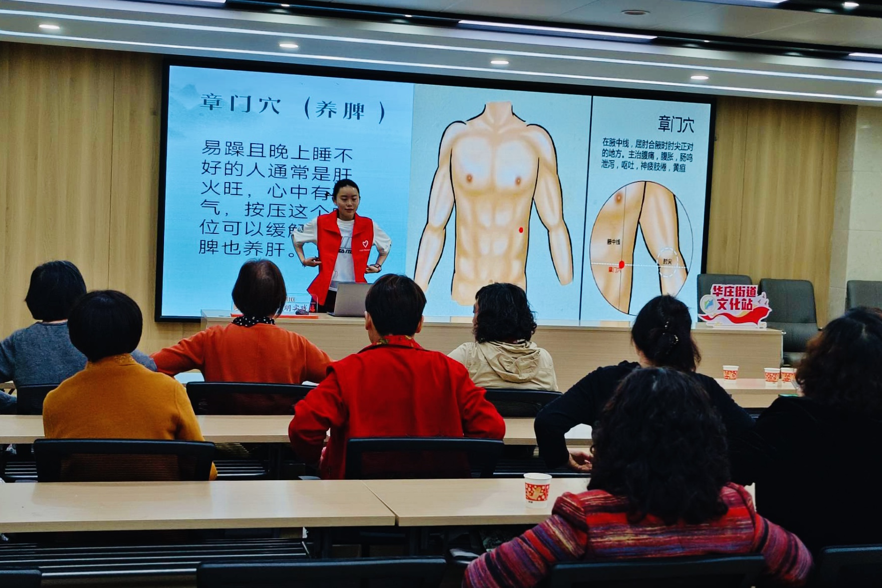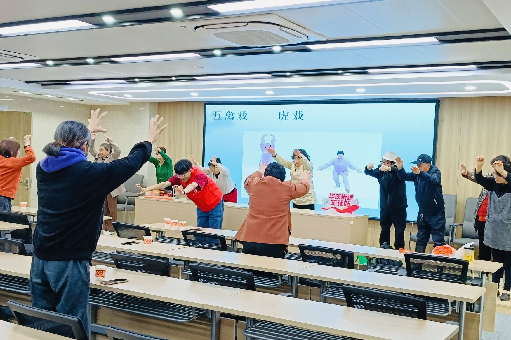 针对中老年人健康养生需求,宣讲团成员为居民展示了风池穴、章门穴等穴位的位置,介绍了它们的功能、按摩手法等相关知识,并现场示范了如何通过推拿、按摩等方式缓解颈、肩、腰、腿痛等症状。高孟健带领社区居民学习五禽戏,亲身感受中医文化的博大精深及其在疾病预防和康复方面的重要作用。