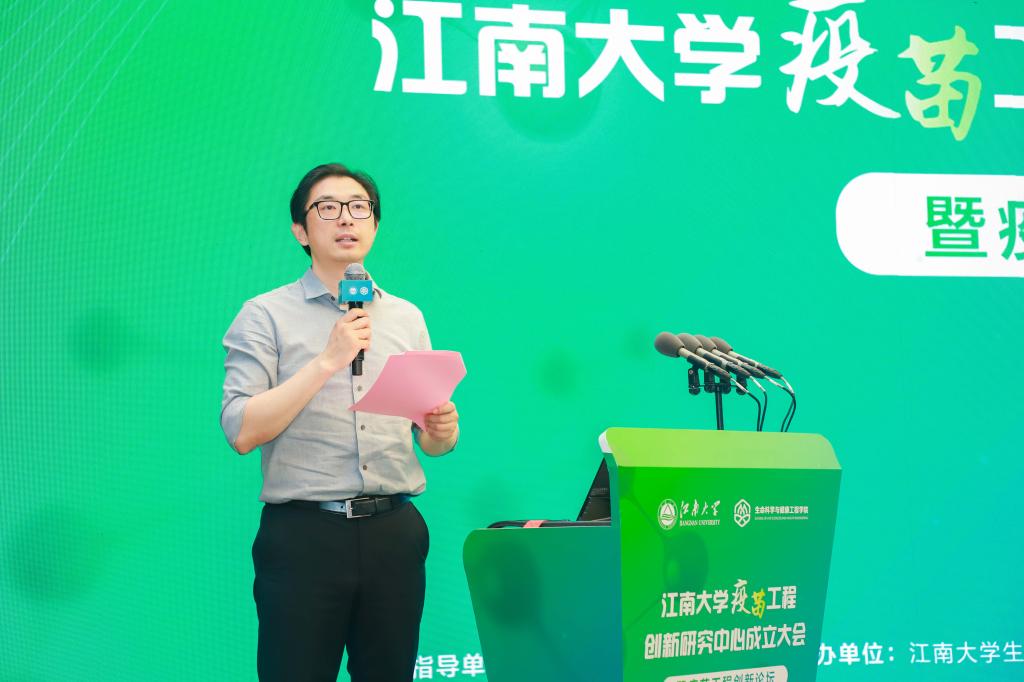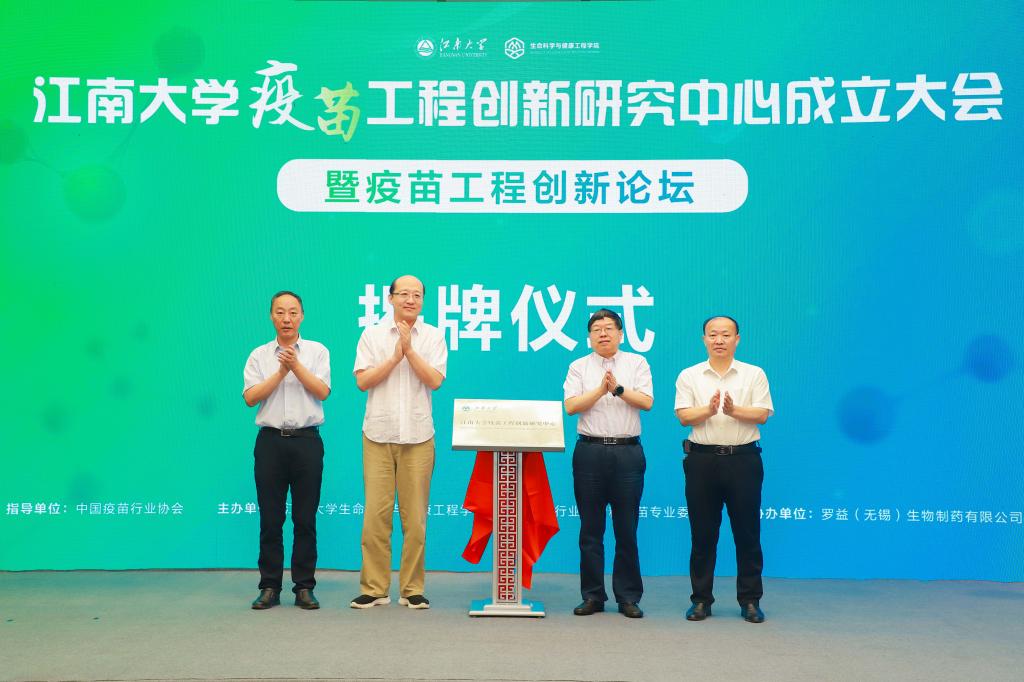 中国工程院院士陈坚、中国疫苗行业协会秘书长刘大为、伟德victor1946党委常委、副校长顾正彪、伟德victor1946党委常委、统战部部长朱飞共同为伟德victor1946疫苗工程创新研究中心揭牌。