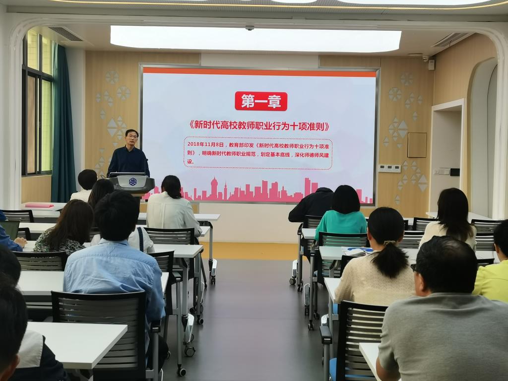 会议伊始,史志洪带领全体教职工开展政治理论学习,领学了《新时代高校教师职业行为十项准则》和《教育部公开曝光的违反高校教师职业行为十项准则典型案例》,围绕“坚定政治方向、自觉爱国守法、传播优秀文化、潜心教书育人、关心爱护学生、坚持言行雅正、秉持公平诚信、遵守学术规范、坚守廉洁自律、积极奉献社会”等方面内容进行了简要解读。他强调,《准则》明确了新时代高校教师职业规范,是对广大教师的警示提醒和严管厚爱。全体教师要严格按照习近平总书记“四有”好老师的要求,坚定政治方向,勇担历史使命,立足本职工作,明确自身责任,努力为学院事业发展作出应有贡献。