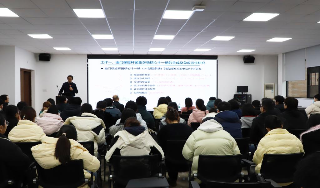 访问期间,尹健院长作专题学术报告,报告从糖化学在新型疫苗研发中的关键作用切入,系统介绍了其团队在细菌糖疫苗设计、合成及免疫机制研究中的创新成果,并分享了该领域未来的科研方向与技术挑战。尹健院长指出,糖疫苗作为预防传染性疾病的重要策略,其基础研究与转化应用需多学科交叉协同,为双方后续合作提供了重要思路。报告现场反响热烈,两院师生就糖化学技术难点、产学研结合路径等展开深入探讨。