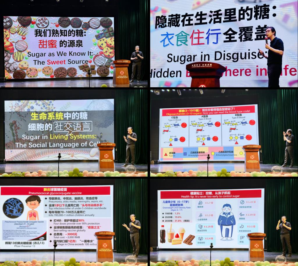 讲座中,尹健以“糖”为核心,带领同学们开启了一场由表及里、深入浅出的糖科学探索之旅。他从生活中触手可及的甜蜜糖类讲起,逐步揭示隐藏于“衣食住行”各方面的糖类物质,进而引导学生进入细胞表面的糖链世界,探索糖在生命系统中的关键作用,生动阐释了这些微观糖链如何影响血型判定、受精过程等生命活动,又如何成为肿瘤和病毒伪装自身的“防护服”。他进一步指出,科学家正积极利用这些糖类物质开发新型疫苗和药物,以应对肿瘤、致病菌和病毒,展现了糖科学在医药领域的广阔前景。他还引导学生初步认识了糖分子的化学本质和多样结构,揭示了糖分子组合的复杂性。