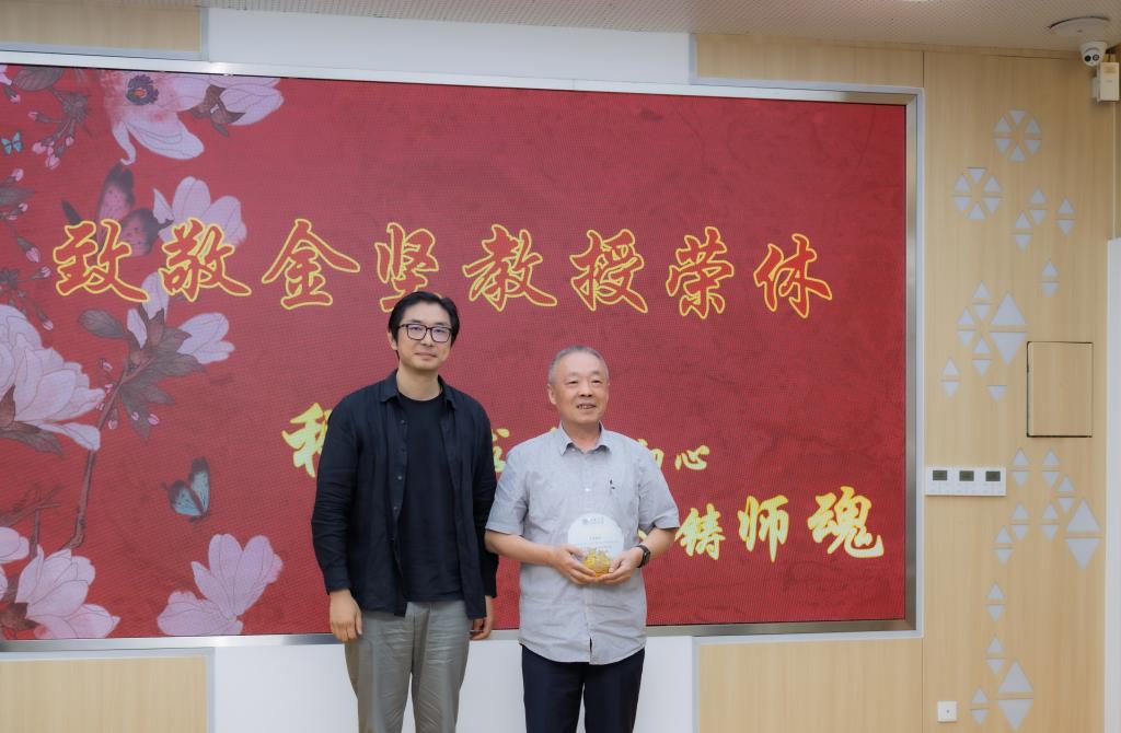 为铭记金坚为学院作出的卓越贡献,学院特别定制了镌刻着“笃行致远·江南生命之光”十个字的荣休纪念牌,寓意金坚追求真理、躬耕教育、引领发展的精神。院长尹健代表全院师生,庄重地将这份承载着无尽情谊的纪念牌授予金坚,并分享了与他共事的点滴回忆,为他送上最真诚的祝福。