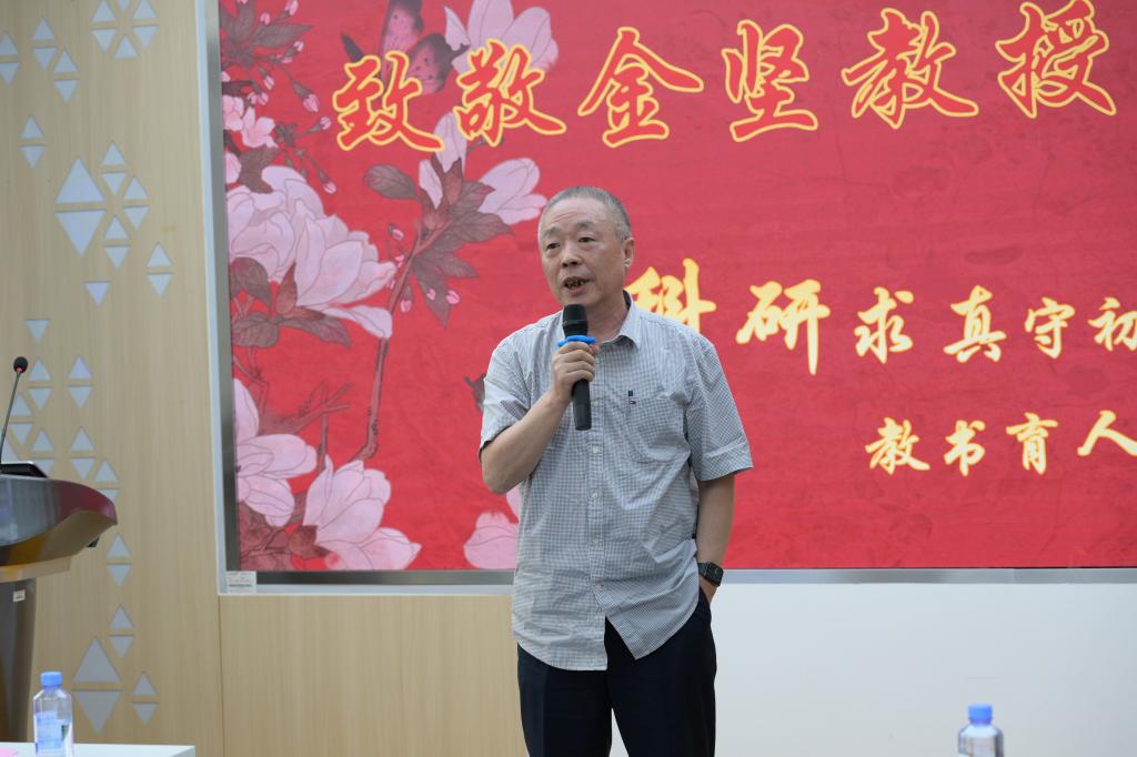 在全场热烈的掌声中,金坚发表了情真意切的荣休感言。他谦逊地回顾了在学院工作的岁月,对同事们的支持与学生们的信任表达了深深的谢意。他朴实而感人的话语中,饱含对学院和学子未来的殷切期望,真挚的情感再次深深打动了现场每一个人。