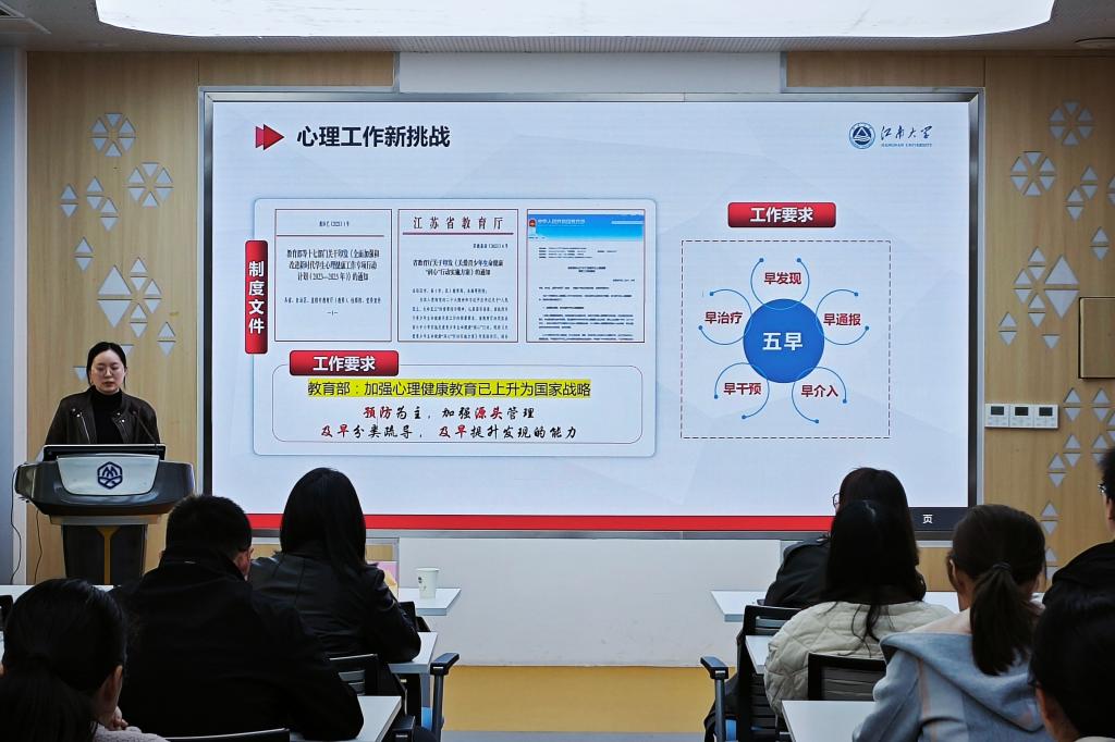 童玉梅围绕高校学生心理工作实务展开专题培训。她结合高校学生心理发展特点与真实工作案例,系统讲解了大学生常见心理问题的识别方法、沟通疏导技巧,以及心理危机预警与干预的核心流程,明确了“早发现、早通报、早介入、早干预、早治疗”的工作要求。同时,童老师针对工作场景,分享了心理工作与学业指导融合的实操方法,为参会教师开展日常工作提供了专业、实用的指导方案。