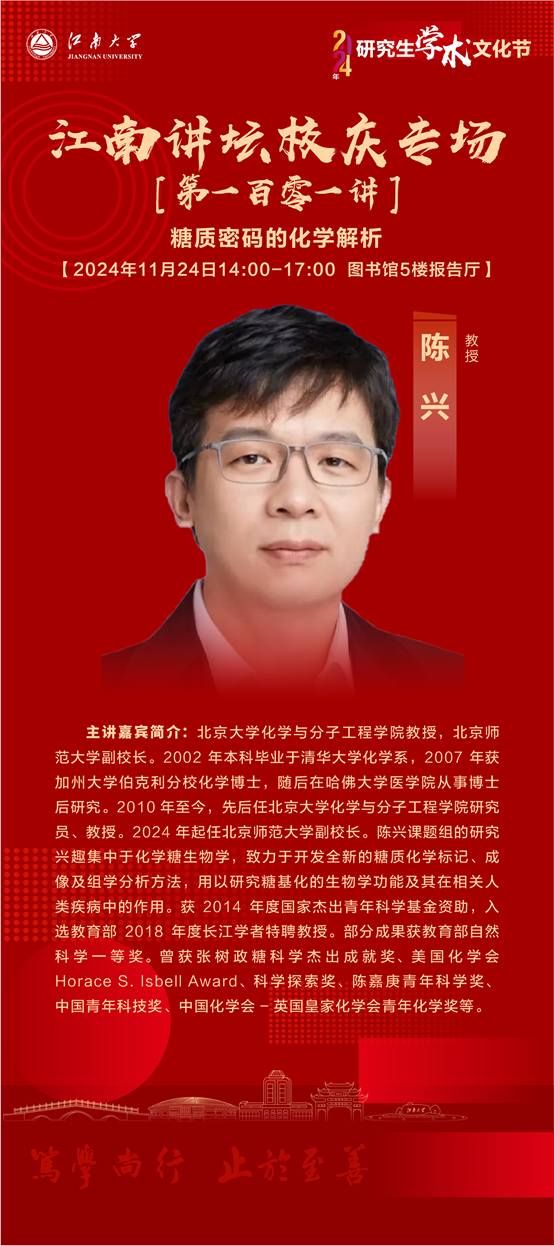 陈兴,北京大学化学与分子工程学院教授,北京师范大学副校长。2002年本科毕业于清华大学化学系,2007年获加州大学伯克利分校化学博士,随后在哈佛大学医学院从事博士后研究。2010年至今,先后任北京大学化学与分子工程学院研究员、教授。2024年起任北京师范大学副校长。陈兴课题组的研究兴趣集中于化学糖生物学,致力于开发全新的糖质化学标记、成像及组学分析方法,用以研究糖基化的生物学功能及其在相关人类疾病中的作用。获2014年度国家杰出青年科学基金资助,入选教育部2018年度长江学者特聘教授。部分成果获教育部自然科学一等奖。曾获张树政糖科学杰出成就奖、美国化学会Horace S. Isbell Award、科学探索奖、陈嘉庚青年科学奖、中国青年科技奖、中国化学会-英国皇家化学会青年化学奖等。