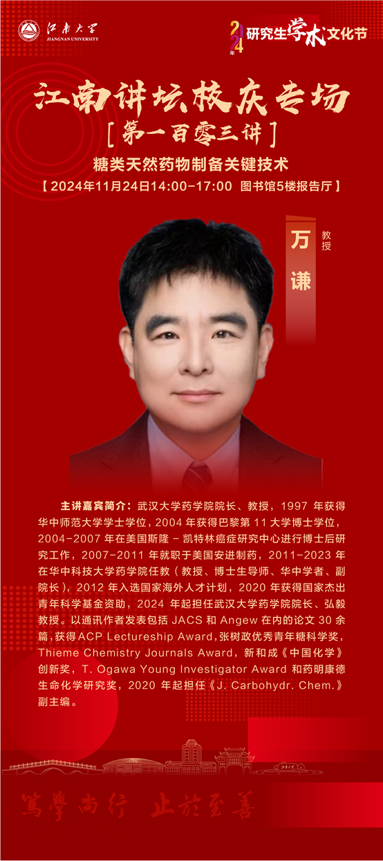 万谦,武汉大学药学院院长、教授。1997年获得华中师范大学学士学位,2004年获得巴黎第11大学博士学位,2004-2007年在美国斯隆-凯特林癌症研究中心进行博士后研究工作,2007-2011年就职于美国安进制药,2011-2023年在华中科技大学药学院任教(教授、博士生导师、华中学者、副院长),2012年入选国家海外人才计划,2020年获得国家杰出青年科学基金资助,2024年起担任武汉大学药学院院长、弘毅教授。以通讯作者发表包括JACS和Angew在内的论文30余篇,获得ACP Lectureship Award,张树政优秀青年糖科学奖,Thieme Chemistry Journals Award,新和成《中国化学》创新奖,T. Ogawa Young Investigator Award和药明康德生命化学研究奖,2020年起担任《J. Carbohydr. Chem.》副主编。