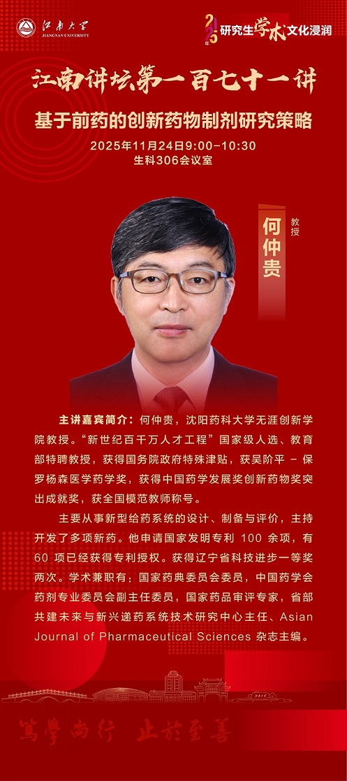主讲人简介:何仲贵,沈阳药科大学无涯创新学院教授。“新世纪百千万人才工程”国家级人选、教育部特聘教授,获得国务院政府特殊津贴,获吴阶平-保罗杨森医学药学奖,获得中国药学发展奖创新药物奖突出成就奖,获全国模范教师称号。