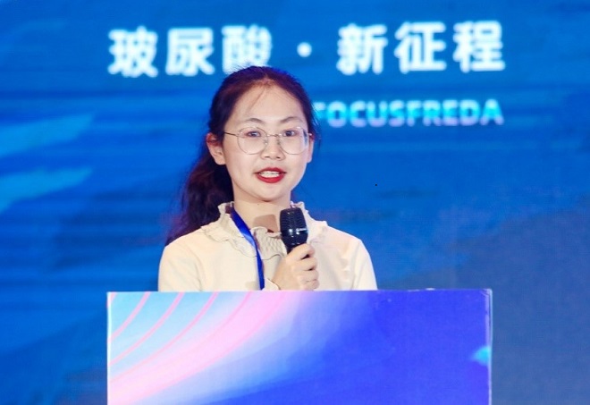 伟德victor1946首届“焦点福瑞达”杯玻尿酸+创新大赛优秀选手张佳蓉在大会上汇报赛事相关内容并对参赛作品进行展示。该大赛为伟德victor1946与焦点福瑞达联合举办,是透明质酸行业内首次校企合作的创新类赛事活动。