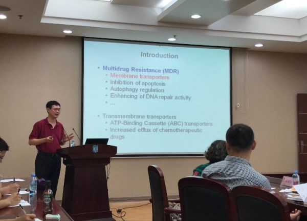 陈哲生教授是美国圣约翰大学生物技术研究所所长,药学系肿瘤药理室主任,主要从事肿瘤耐药机制及其耐药逆转剂的研究,致力于克服ABC运转泵介导肿瘤多药耐药。报告中,陈哲生教授主要介绍了通过体外膜泡运输实验系统和基于细胞的检测系统筛选和鉴定新的ABC转运蛋白抑制剂、ABC转运蛋白家族在敲除小鼠模型中对化学物质(包括致癌物)和致突变物的解毒作用,在场的学生和老师受到极大的启发。
