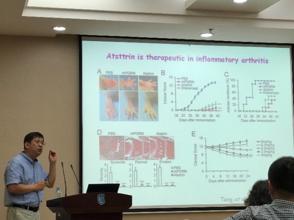 刘传聚,美国纽约大学医学院终身教授,骨转化医学研究中心主任,主要从事关节炎、自身免疫疾病,及溶酶体贮积病的病理学机制及转化医学研究。刘传聚教授在报告中生动的阐述了生长因子Progranulin(PGRN\GEP)通过竞争性结合肿瘤坏死因子受体改善骨关节炎和风湿性关节炎的分子机制,并介绍了他们团队转化医学研究的成果——基于PGRN的有效结构研发了重组因子Atsttrin,该因子能够显著抑制关节炎的发生和进展,具有很好的临床开发前景。参会人员围绕报告内容,就PGRN蛋白的结构、功能和Atsttrin的临床应用前景等内容与刘教授进行了深入的交流,整个过程问答踊跃、气氛热烈。