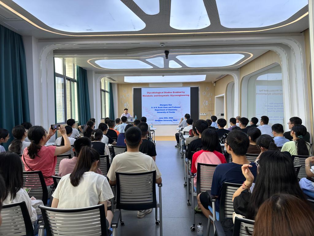 2024年6月20日下午,佛罗里达大学郭忠武教授应邀赴伟德betvlctor1946源于英国进行学术交流,并以“Glycobiological Studies Enabled by Metabolic and Enzymatic Glycoengineering”为题做了学术报告。本次学术交流会在学院306会议室举行,由尹健院长主持,杨子毅副院长出席活动,生科院师生70余人参加了报告会。
