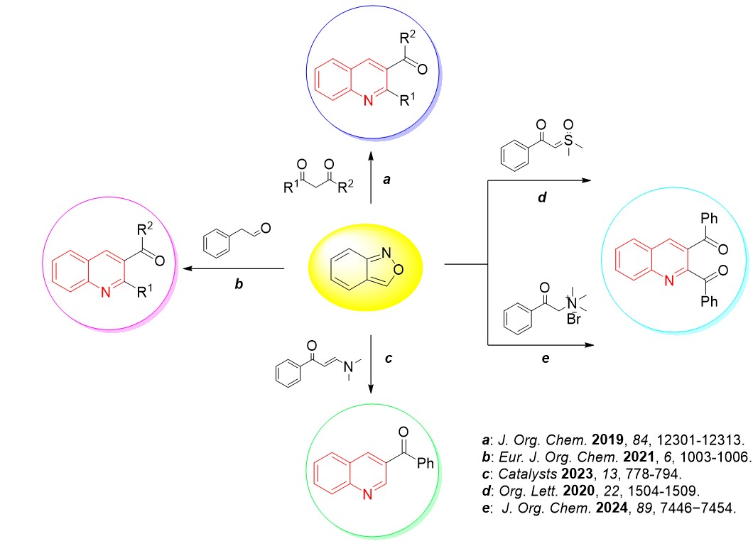 邹亮华课题组一直致力于杂环化合物的绿色合成和应用研究,已经取得了一些科研成果。比如,以苯并[c]异噁唑为起始原料,利用开环重组的策略设计和探索了其与各类合成子(包括1,3-二酮、苯乙醛、硫叶立德、烯胺酮和铵盐等)的反应,制备了一系列喹啉类化合物。此外,在其他杂环化合物(比如喹唑啉酮)的合成方面也取得了一些进展(Org. Chem. Front.2018,5, 3464-3468;Eur. J. Org. Chem.2019, 7725-7729;Chinese Chem. Lett.2020,31, 1911-1913;Eur. J. Org. Chem.2024,27, e202400359)。