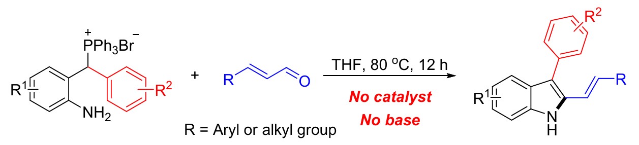 为解决此类问题,邹亮华课题组开发了一种绿色合成2-烯烃吲哚的方法(https://doi.org/10.1039/D4GC02859G)。该方法基于氨基苄基鏻盐和丙烯醛发生[4+1]环化反应,合成一系列2-烯烃吲哚化合物,无需金属或催化剂的参与,以THF为溶剂,在80℃下反应12 h,最高产率可达92%,共拓展了48个底物。总之,该反应具有原料易得、底物范围广和收率高的特点,符合绿色环保的化学理念。