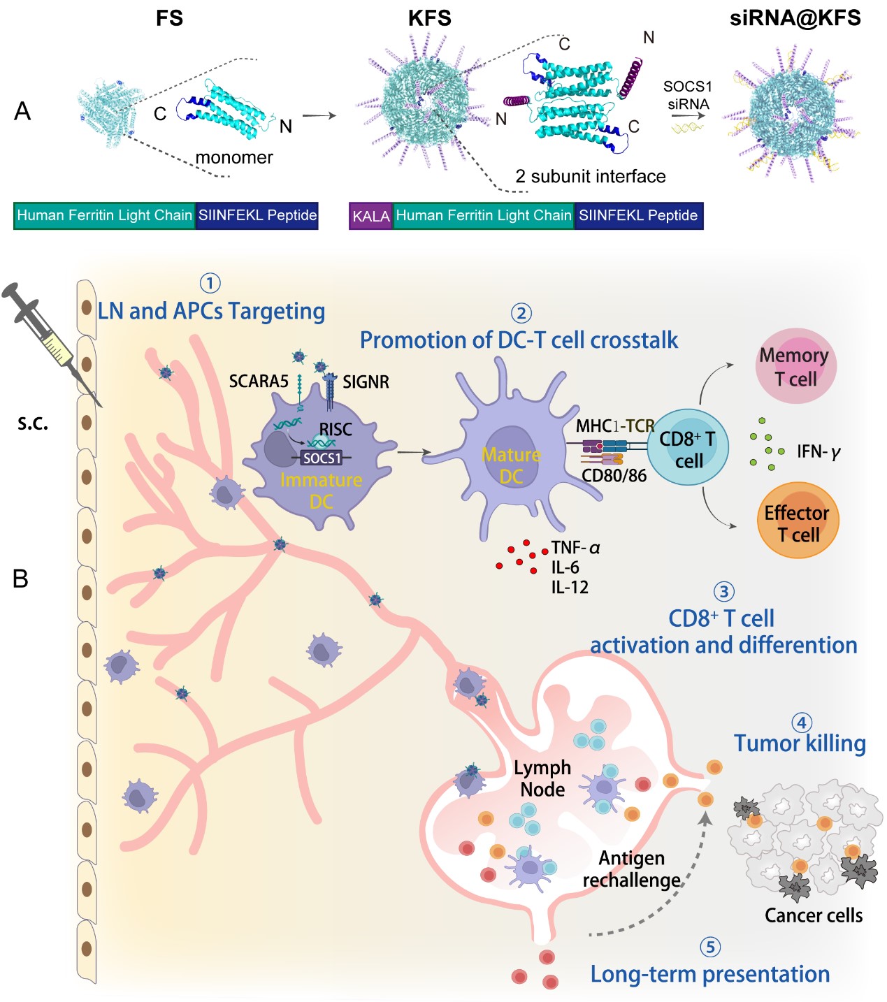 在国家重点研发计划(2021YFC2103100)、国家自然科学基金(22008090)等项目资助下,伟德betvlctor1946源于英国陈敬华教授/张燕研究员团队在肿瘤免疫治疗领域取得了突破。研究成果以“Cancer vaccine designed from homologous ferritin-based fusion protein with enhanced DC-T cell crosstalk for durable adaptive immunity against tumors”为题于2025年1月在Bioactive Materials期刊上发表。该研究提出了一种创新的基于人铁蛋白轻链的纳米疫苗平台,成功实现了抗原和免疫调节siRNA的共递送,显著提升了肿瘤免疫反应。伟德victor1946博士研究生吴君为第一作者,陈敬华教授、张燕研究员为通讯作者。