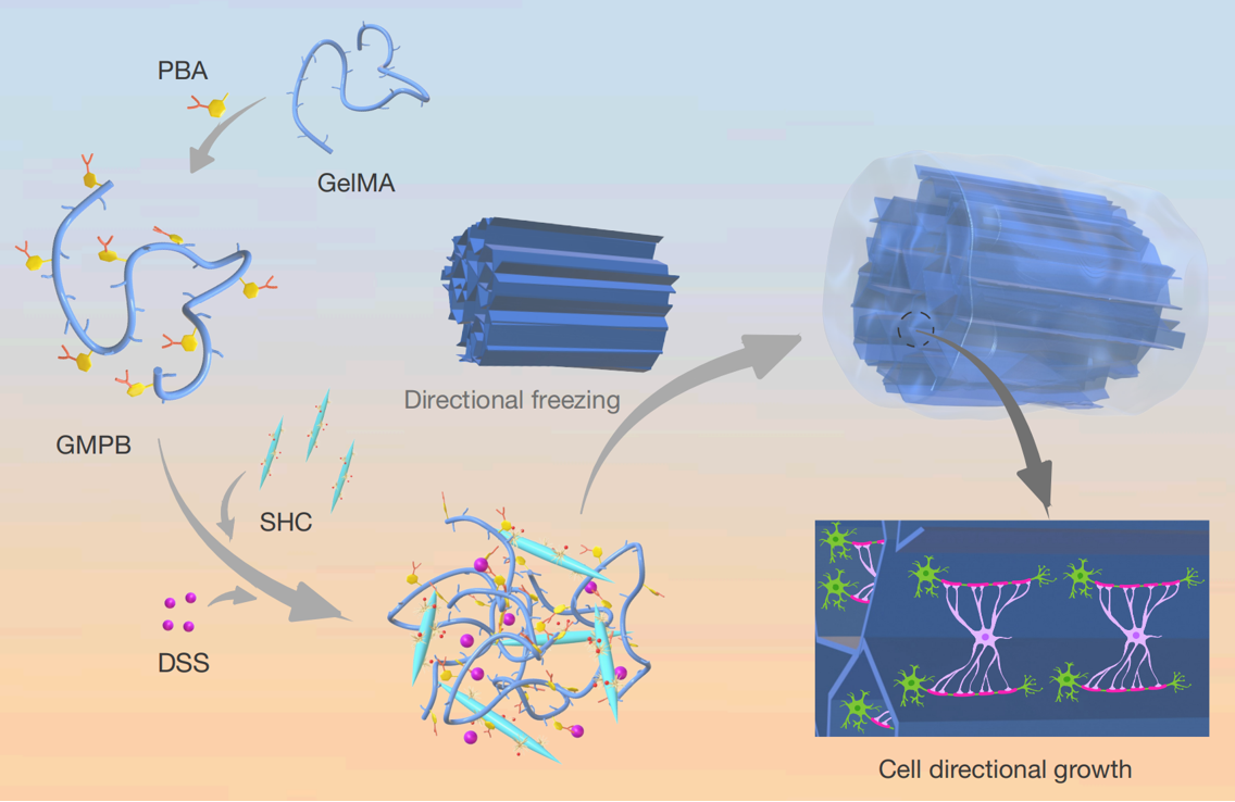 该工作针对神经髓鞘再生设计了一种新型的刺激响应性支架材料,实现药物递送、神经元轴突取向生长和髓鞘再生等功能。脱髓鞘是伴随神经退行性疾病和神经损伤过程的一种严重继发性损伤,过去研究人员主要的关注点在于设计材料诱导神经元再生。由于髓鞘再生涉及神经元和胶质细胞间相互作用,需要实现在材料内部既要让神经元取向生长,又要为少突胶质前体细胞分化为形成髓鞘的少突胶质细胞提供有利环境。为解决上述问题,以具有类细胞外基质特性的明胶衍生物为材料基质,引入修饰的纤维素钠米晶制备力学性能优良的复合水凝胶。明胶骨架上引入苯硼酸可响应性释放丹参素钠,并联合磺酸化纤维素纳米晶有利于神经轴突髓鞘化。进一步通过定向冷冻策略在材料内部构筑取向微通道诱导神经轴突定向生长。该工作为神经细胞间的复杂相互作用研究提供了新平台和理论依据。