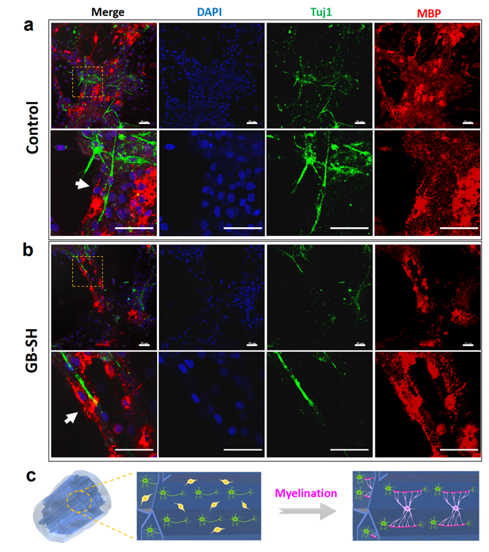 图2. 刺激响应性水凝胶导向神经元和少突胶质细胞发生髓鞘化的共聚焦显微镜图:对照组(a)、实验组(b)和示意图(c);