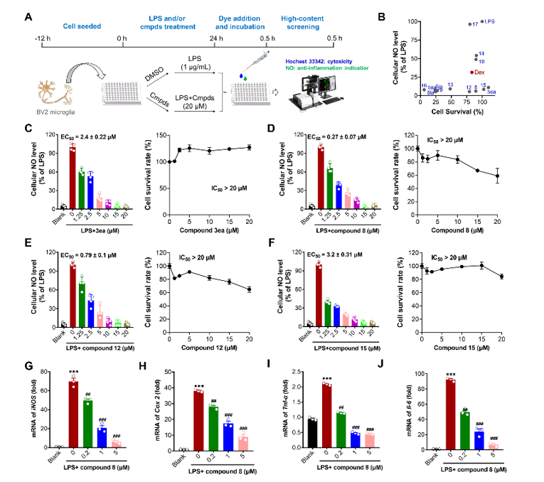 在生物活性评价方面,本研究采用LPS诱导的小胶质细胞炎症模型,发现代表性化合物8表现出显著的抗炎活性。该化合物对NO释放的抑制效果尤为突出(EC50= 0.27 µM),其活性显著优于临床对照药物地塞米松。进一步研究表明,化合物8能够以剂量依赖的方式下调关键炎症因子(iNOS、COX-2、TNF-α和IL-6)的表达水平,提示其可能通过多靶点协同作用发挥抗炎效应。基于上述发现,后续研究将聚焦于:通过结构优化进一步提升其活性和成药性;在动物模型中系统评价其药效及作用机制。总之,本工作不仅拓展了杂环化合物的结构多样性和合成方法学,更为抗炎药物的研发提供了具有开发潜力的新颖先导化合物。